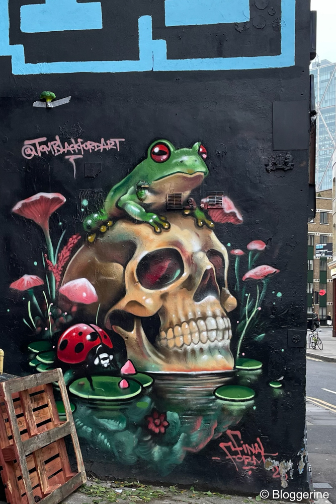 Nach 20 Minuten in der Central line sind wir U-Bahnstation Liverpool Street angekommen und sind den Rest zu Fuß zum Spitalfield Market gelaufen. Man kommt an verschiedenen Skulpturen vorbei, die die Ziege, die Feige und die Birne sowie an den Elefanten. In der Straße reihen sich ein kleiner Laden, meist Klamotten und Dinge für Hipster, an den anderen. Die Angebote der Läden sind eher nicht so meins. Der Bereich dort inkl. des historischen Marktes, heißt Spitalfield Market. Ich wollte aber über den überdachten Old Spitalfields Market schlendern, Mittwochs ist Urban Makers Wednesday. Habe promt was gefunden, ein Aquarell mit Erdbeeren ist es worden. Essn gibt es auch ausreichend. Wir waren dann noch weiter im East End unterwegs, u.a. Brick Lane um Grafittis anzusehen und auf dem Vintage Markt zu stöbern. Dort war ich bereits im April mit K2 und wir haben dort den aktuellen Lieblingspullover von K1 gekauft.